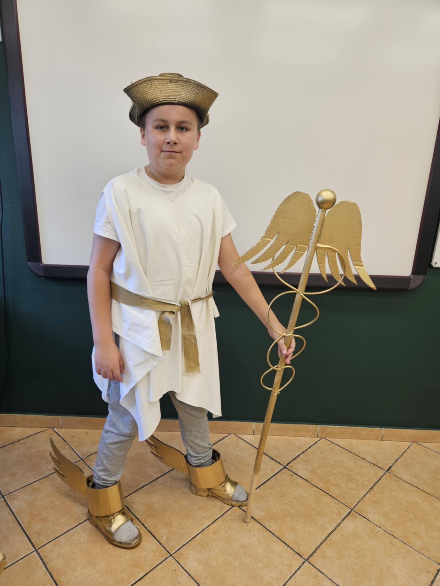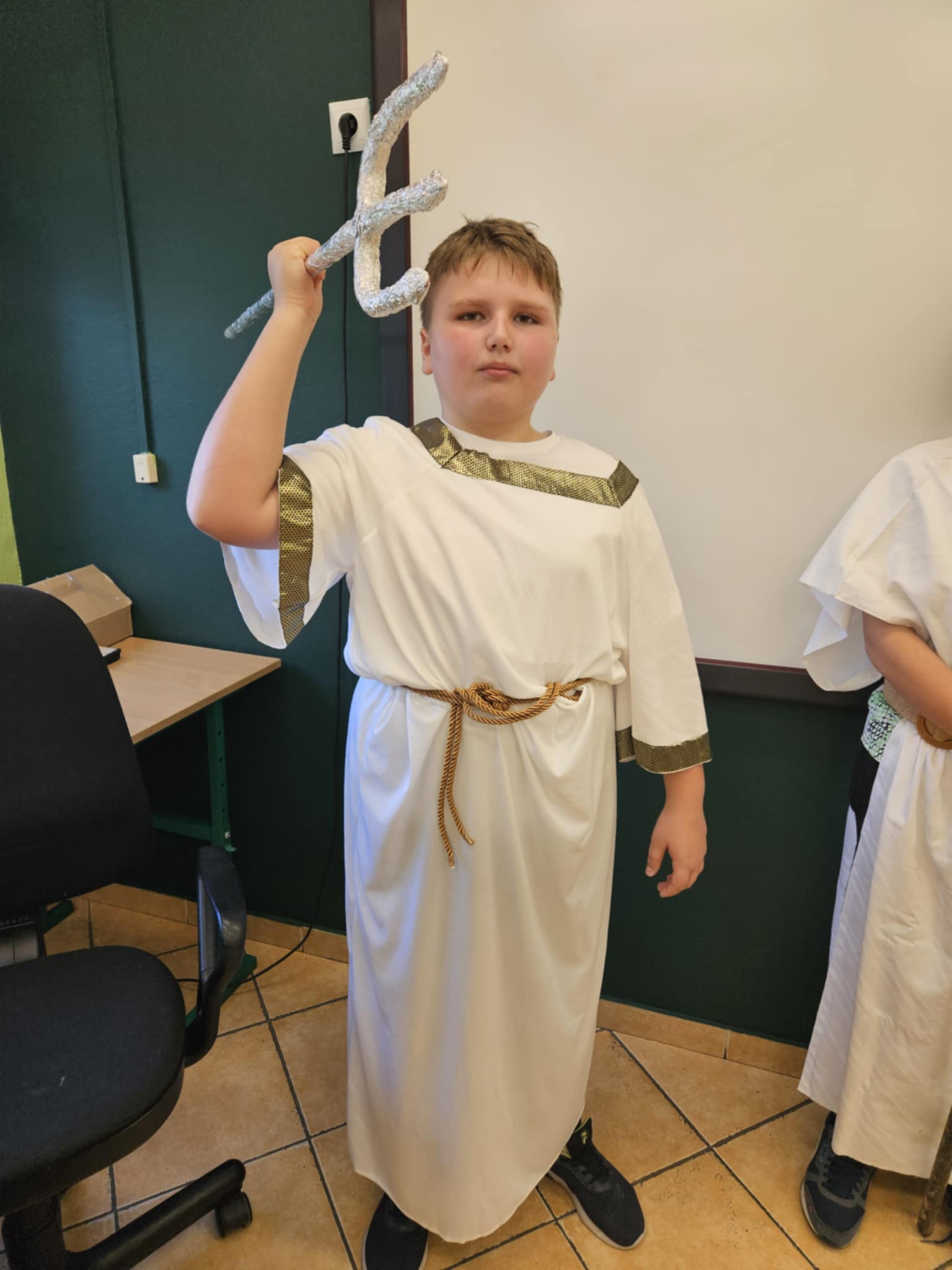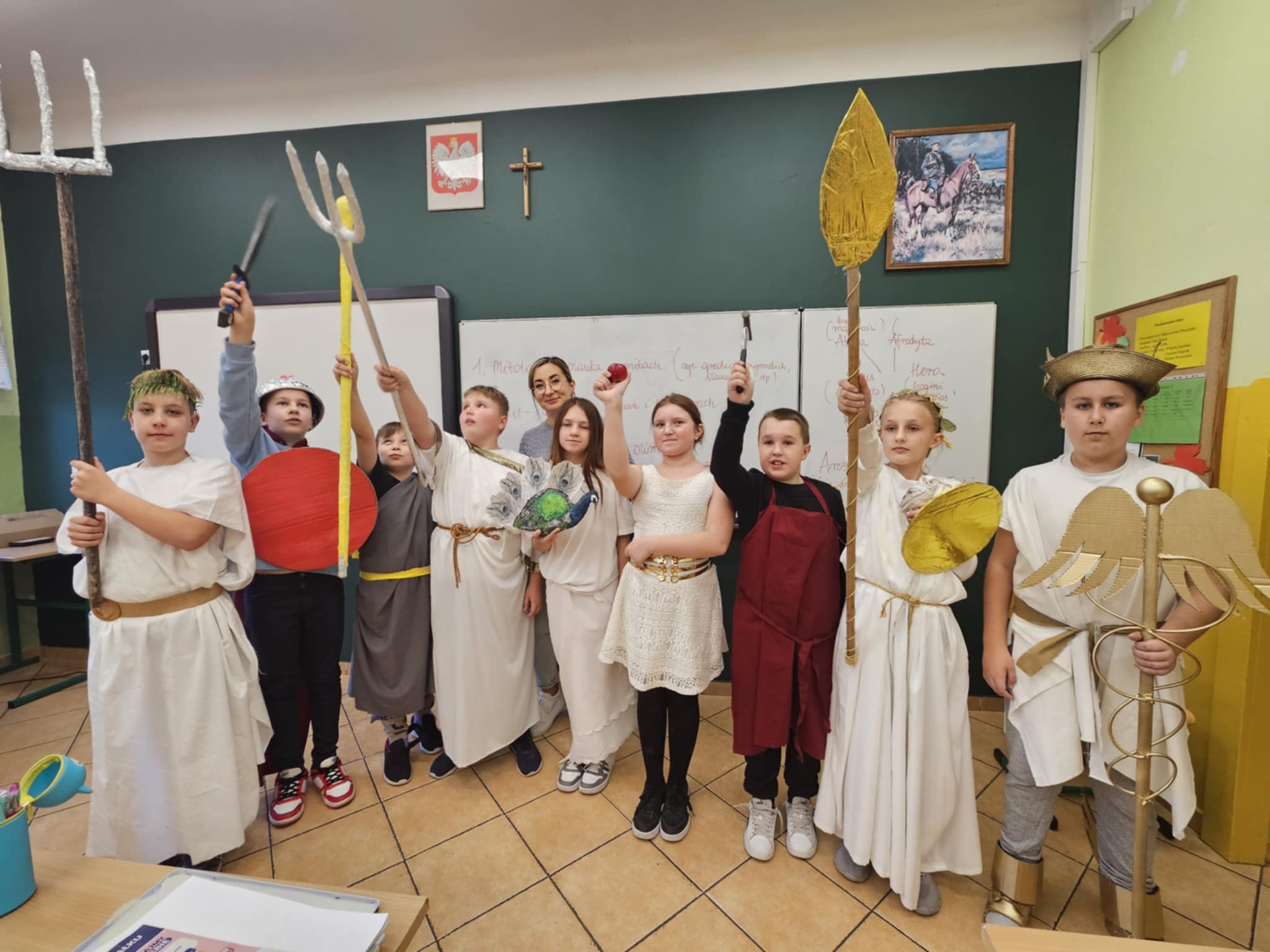 Dnia 22 października 2024 r. w klasie V na lekcji historii uczniowie wcielili się w bogów olimpijskich ze starożytnej Grecji. Był to pomysł na aktywne zajęcia, który miał na celu utrwalenie wiedzy na temat starożytnej Grecji oraz poznanie ciekawostek na temat poszczególnych bogów. Wszyscy świetnie się bawili podczas przebierania i prezentowania atrybutów władców Olimpu. Tego dnia w ławkach szkolnych zasiedli: Atena, Afrodyta, Hera, Hades, Zeus, Ares, Hefajstos. Nie zabrakło też boskiego korowód, który odwiedził klasy młodszych koleżanek i kolegów ze szkoły.