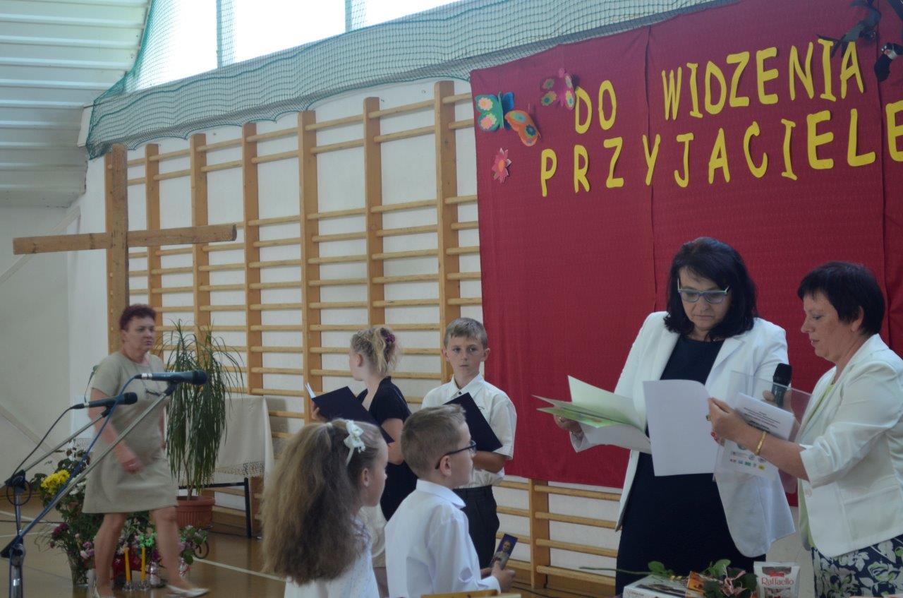 W piątek 26 czerwca uroczyście zakończyliśmy rok szkolny 2014 /2015 . Spotkanie to poprzedziła Msza Święta prowadzona przez Ojca Opata Eugeniusza Augustyna . Po otrzymaniu wakacyjnego błogosławieństwa rozpoczęła się oficjalna część uroczystości . Uczniowie klasy VI przekazali swoim młodszym kolegom Sztandar Szkoły oraz złożyli ślubowanie . Pani Dyrektor ciepłymi słowami pożegnała tegorocznych absolwentów i życzyła im dobrych wyników w dalszej edukacji . Gratulacje klasie VI złożył także Burmistrz Jarosław Samela . Ponadto przekazał zebranym informację , iż po zasięgnięciu wielu opinii podjął decyzję o przedłużeniu Pani Bożenie Wronie funkcji dyrektora szkoły na kolejne 4 lata. Ta informacja wywołała burzę oklasków
