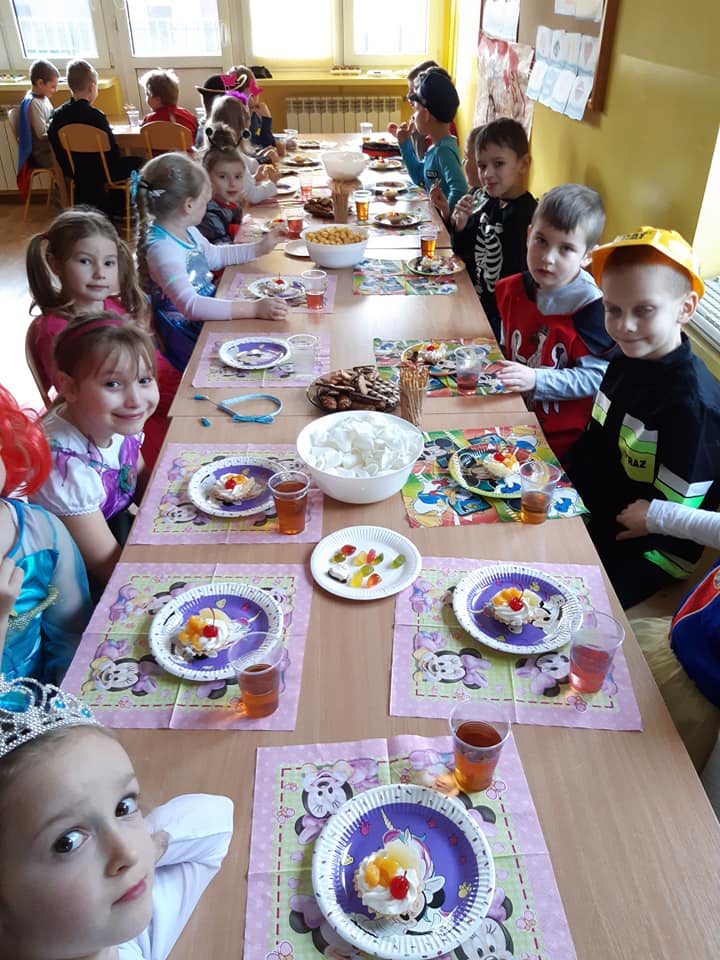 W ostatni piątek tegorocznego karnawału odbył się pierwszy bal Wesołych Skrzatów. W pięknie przystrojonej przez wychowawczynię sali tańczyły przeróżne postacie z bajek. Prym wśród dziewczynek wiodła królowa Elza z Krainy Lodu a wśród chłopców królował Marshall z Psiego Patrolu. Były tańce w parach i solo, korowody, konkursy, kilka razy przez salę przejechał karnawałowy pociąg. W przerwie między wyczerpującymi pląsami dzieci skosztowały pyszności przygotowanych przez rodziców. Bal przedszkolny dostarczył maluchom niezapomnianych wrażeń i wiele radości. Dziękujemy rodzicom za pomoc w jego organizacji.