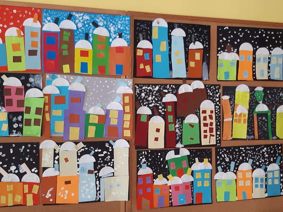 Na dzisiejszych zajęciach dzieci z zerówki poznały kolaż. Jest to technika plastyczna polegająca na formowaniu kompozycji z różnych materiałów. Mali artyści wykorzystali w swoich pracach papier kolorowy oraz płatki kosmetyczne. Wycinając różne geometryczne kształty dzieci stworzyły miejską zabudowę. Trzeba przyznać, że wspaniale wyszły kolorowe kamienice w zimowej szacie. Brawo!