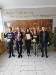 Zespół uczniów z kl.VI : Julia Piętak, Maria Sabatowska, Zuzanna Turakiewicz, Amelia Śmiecikowska, Adam Połeć wzięli udział w konkursie organizowanym przez I Liceum Ogólnokształcące im.J.Słowackiego w Skarżysku-Kamiennej.  Był to konkurs: „Przybysze- emigranci- uchodźcy. Dzije Skarżyska- Kamiennej , regionu świętokrzyskiego i Polski z perspektywy ludzkich losów i indywidualnych Historii”. Prezentacja wykonana przez uczniów została zakwalifikowana do finału, który odbył się 14.12.2022r. Tuż przed świętami, 22.12.2022r. przybył do naszej szkoły jeden z organizatorów- historyk p.Piotr Kardyś, który uroczyście wręczył uczniom nagrody-  gratyfikacje – vouchery w wysokości po 100 zł. Opiekun- pani Beata Sikorska, również otrzymała pamiątkowe pióro Parkera. Praca konkursowa dotyczyła dziejów Cystersów w Wąchocku. Dodatkowym atutem było zaprezentowanie przez Adama Połeć stroju zakonnego Cystersów i omówienie jego elementów. O aspekt merytoryczny zadbał o.Zachariasz, który udostępnił strój Cystersa i przeszkolił w zakresie jego nazewnictwa.
