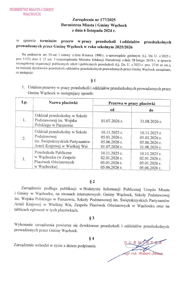 Przerwa w pracy oddziałów przedszkolnych w roku szkolnym 2025/2026