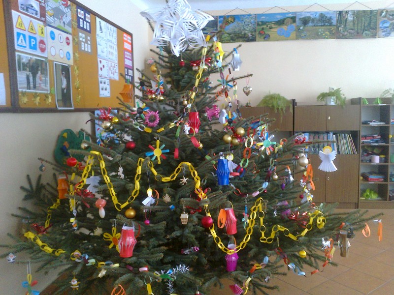 Święta Bożego Narodzenia są szczególnym i wyjątkowym czasem w naszym życiu. Mają one swoją odpowiednią oprawę zewnętrzną. Jednym z symboli tych dni jest choinka. Uczniowie klasy I otrzymali od rodziców Jędrzeja Grzegórskiego 2m choinkę. Po zawieszeniu szklanych ozdób wspólnie z wychowawczynią postanowili dodatkowo ubrać ją własnoręcznie wykonanymi ozdobami. Na drzewku znalazły się: wielobarwne łańcuchy, lampiony, pawie oczka, aniołki, gwiazdki, wyroby z masy solnej. Dziś w epoce komputerów i robotów okazuje się, że nic nie jest w stanie zastąpić ludzkich rąk nawet tych małych, które potrafią zdziałać przepiękne i eleganckie dzieła. I tak stało się w klasie I – wykonane ozdoby