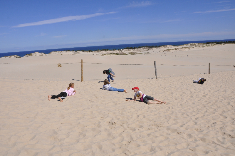 Nabraliśmy sił przez noc i rano możemy podjąć nowy trud i odczytać nową kartkę z książki. Śniadanie wcześniej i wyjście na ruchome wydmy. Udajemy się do Łeby i maszerujemy brzegiem morza. Dzisiaj wzburzone fale towarzyszą nam w drodze. Zawiewa wietrzyk, ale słonce też nas nie opuszcza. Obserwujemy przyrodę która zmienia swoje oblicze. Piasek coraz jaśniejszy, suchy, zajmujący coraz większy obszar plaży. Wkraczamy w sferę wydm. Obraz pustynny : rozległy piasek usypujący wyżyny góry i równiny.  Nogi z trudem przenosimy jedna za drugą pod ciężarem piasku. Podziwiamy niesamowity w swoim wyrazie krajobraz. Pustynia usytuowana między jeziorem Łebsko i morzem. W ten słoneczny dzień bezchmurne niebo łączy się na horyzoncie z wodą. Zauroczeni wyruszamy w drogę powrotną do wyrzutni rakiet, a następnie wsiadamy na statek i płyniemy po jeziorze Łebsko. Spokojna woda unosi nas lekko do brzegu. Wracamy do budynku. Zmęczone ciało możemy zrelaksować w kąpieli wodnej. Pan ratownik czuwa na d naszym bezpieczeństwem. Wszelkie bóle odchodzą i możemy dalej pokazywać swoją energię po kolacji grając w piłkę, tańcząc na dyskotece. Na terenie ośrodka pojawiły się inne grupy, więc zawiązują się nowe znajomości, wymiany numerów telefonu. Najstarsi chłopcy Maciek, Gracjan, Marek, Krzysio, Jędrek to bożyszcze, dziewczyny z innych przyjezdnych grup pod ich oknami  wzdychają. Jak to się czasy zmieniają. Niestety cisza nocna nieubłagalnie nadchodzi i trzeba zamknąć na dzisiaj książkę. Dobranoc.